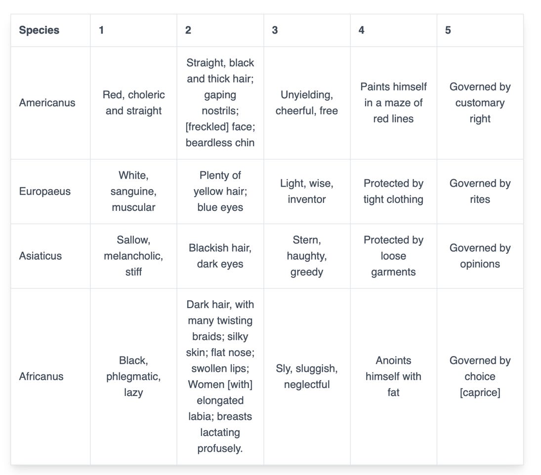 When Linnaeus got around to man, homo sapiens, he “identified” four sub-species that were arbitrarily linked to the colors of the four cardinal humors – blood, phlegm, yellow and black bile – which he classified as Americanus, Europaeus, Asiaticus, and Africanus. He listed five categories of personal, completely arbitrary distinctions, to classify them, skin color, physical traits, behavior, clothing type, and government summarizing them as: