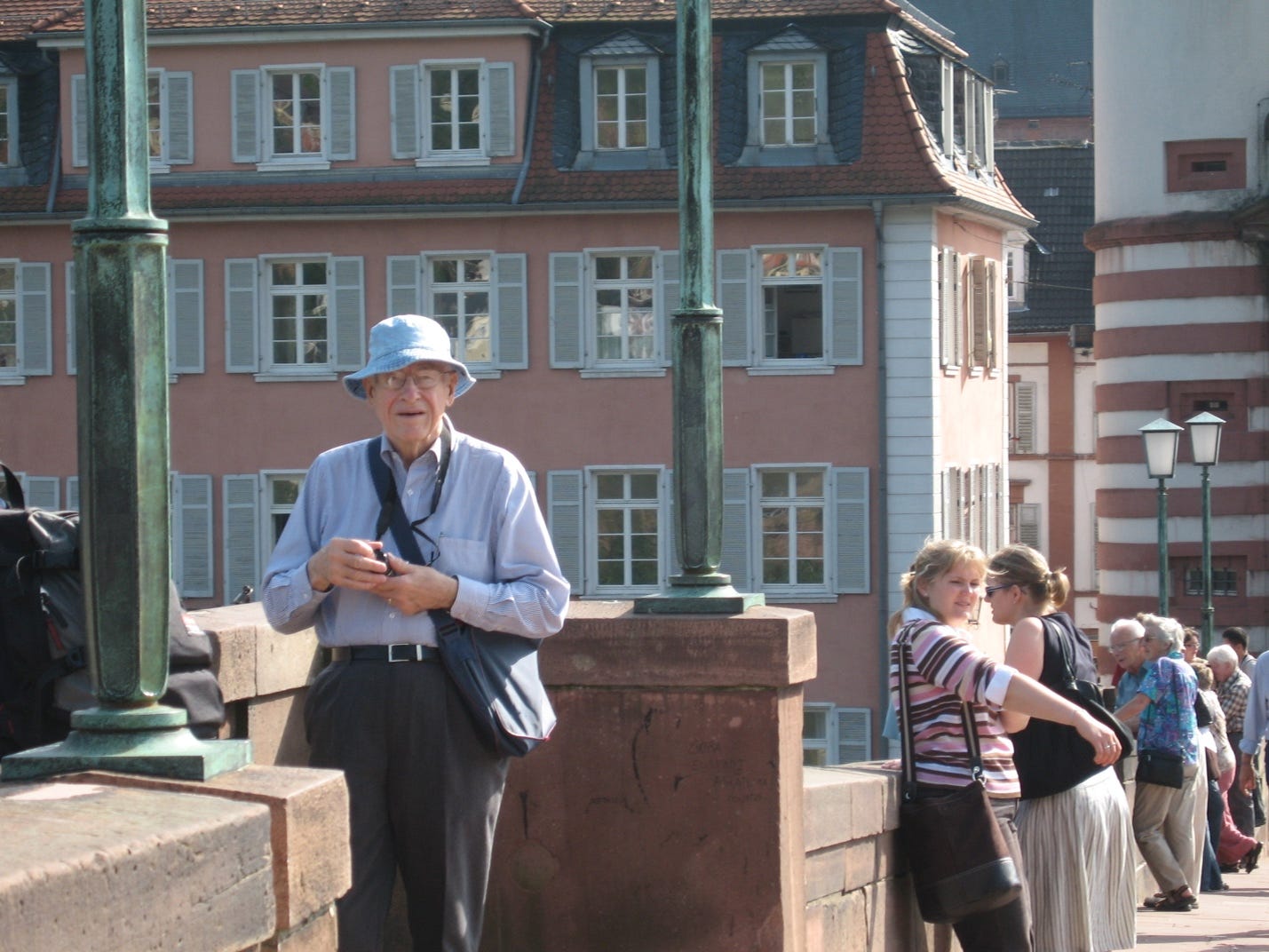 Photos: Dr. Kyle sightseeing on bridge over the Neckar River in Heidelberg, Germany (ca. 2009); cover page of Dr. Kyle’s Master’s thesis.