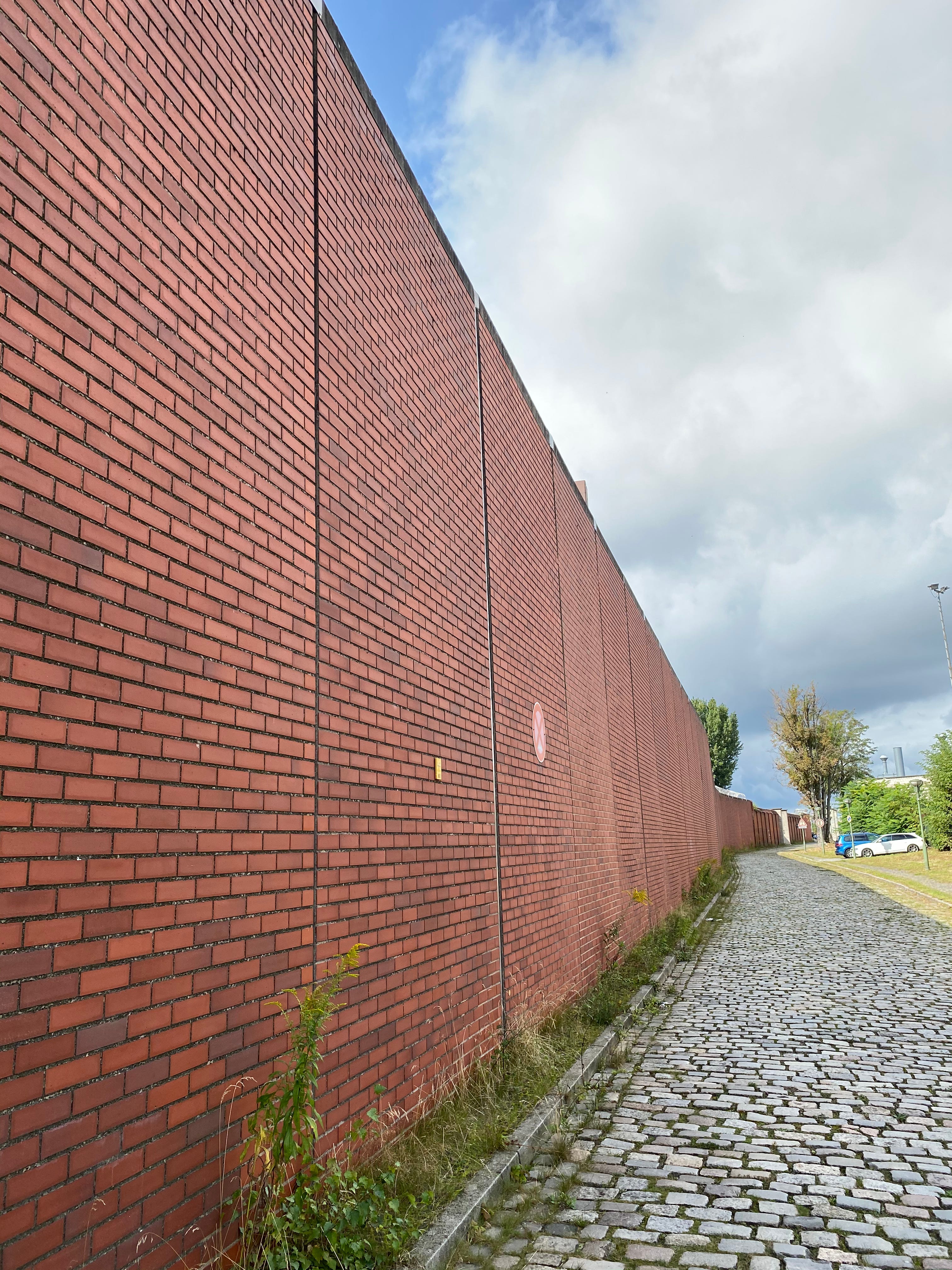 We’re going to take a brief walk on the cobblestone street, Huttigpfad, with the high prison wall to our left. To our right, between us and one of Berlin’s many canals, is an industrial/warehouse zone, making our destination somewhat improbable. You’ll see our destination across from the small parking lot down the street, a small opening, the white strip interrupting the continuous red brick wall.