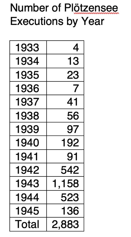 Existing concentration camps expanded and new ones were built in the newly conquered territories in eastern Europe after the Final Solution was planned and initiated at the Wannsee Conference, which took place just a few miles southwest of Plötzensee on January 20, 1942. (As you will recall, Roland Freisler, the architect and chief judge of the Volksgerichtshof was one of the attendees.) By this time, a majority of German Jews had already been eliminated – shot in Rumbala forest south of Riga, Latvia, sent to existing camps and jails, forced into ghettos in eastern Europe, and a relative few were able to escape and emigrate to Palestine and other nations around the world. The U.S. mostly restricted their entry.[2]