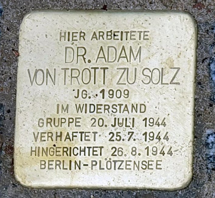 Had the July 20 assassination of Hitler succeeded and installed a new government, Trott was designated to be its foreign minister. Instead, when it failed, Trott was arrested in his office five days later, tried before Freisler’s Volksgerichtshof, and executed at Plötzensee on August 26, 1944.